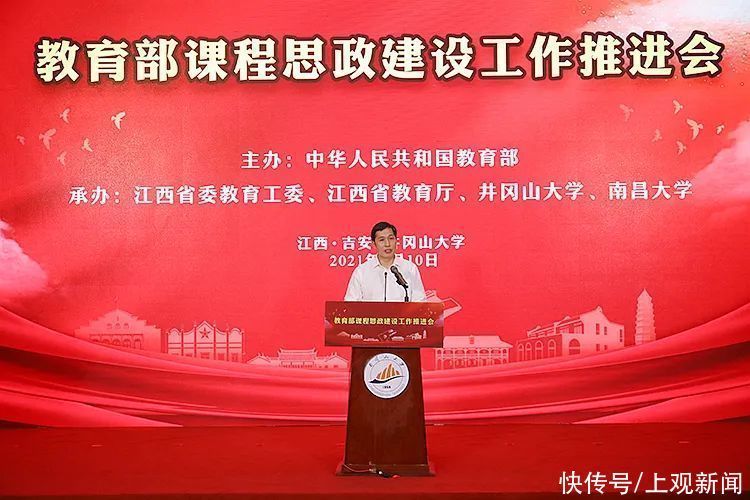6月10日,教育部在江西井冈山大学召开课程思政建设工作推进会。教育部党组成员、副部长钟登华出席会议并讲话。江西省委常委、宣传部部长石小林出席会议。会议公布“课程思政示范课”699人,“课程思政教学师资队伍”699人(含本科生300人),“课程思政教学研究示范中心”30人(含本科生15人,高职15人) ),启动10个课程思想政治资源库建设。